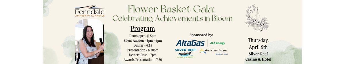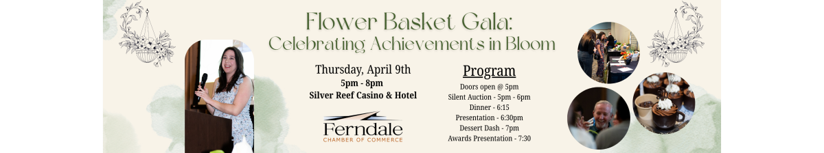 The Ferndale Chamber of Commerce is thrilled for the return of our annual awards banquet! This year’s event is a fundraiser for the Main Street Flower Basket Program and a celebration of business members in our community. The Gala will take place Thursday, April 9th at the Silver Reef Casino. Doors open at 5PM, dinner at 6:15PM.